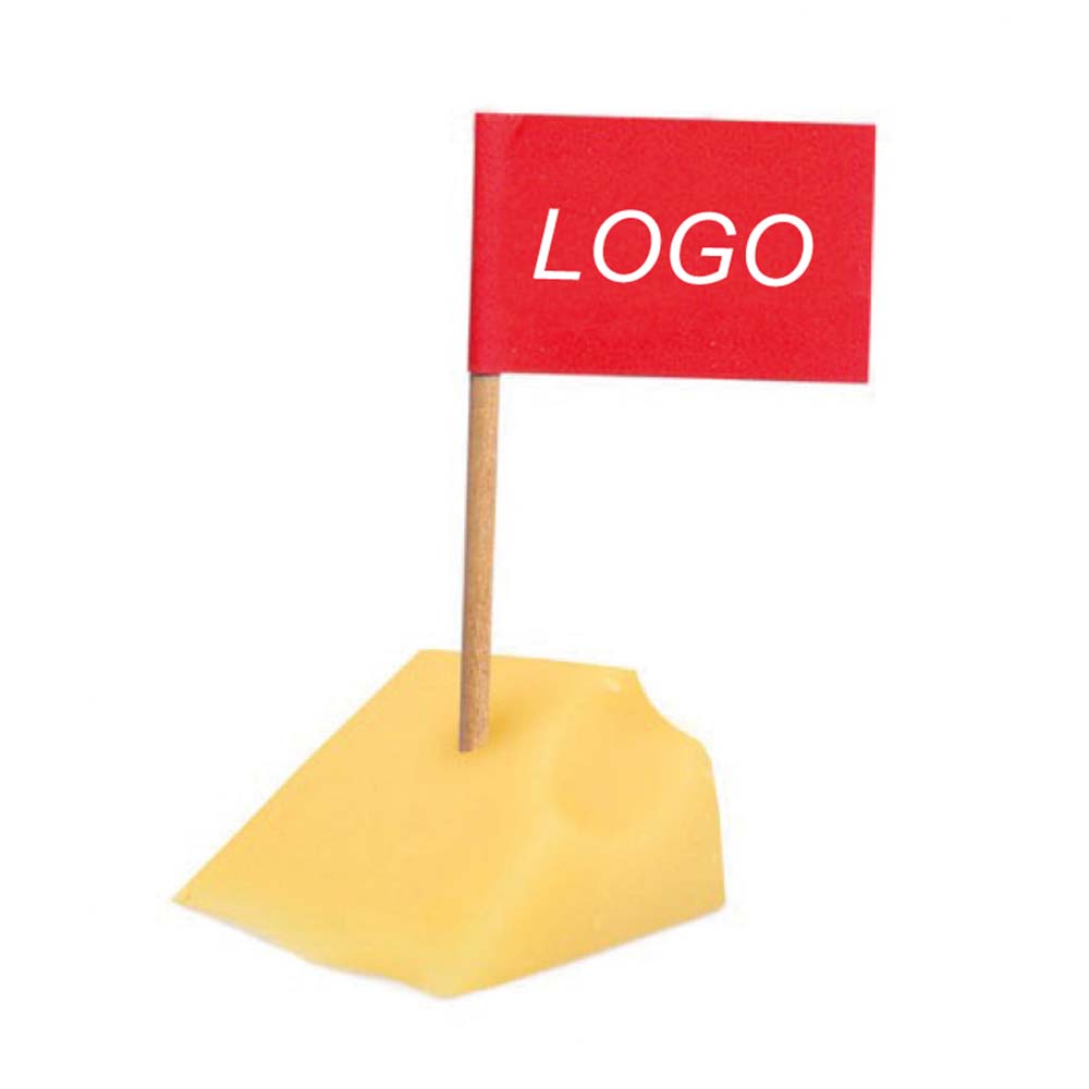 Beidseitiger 4-farbiger-Digitaldruck der Zahnstocher-Fähnchen in Standardqualität als Käsepicker mit Ihrem Motiv oder Logo. 135 g/m² weißes MC Glanzpapier auf einem ca. 70 mm langen Holzspieß aufeinander geklebt.